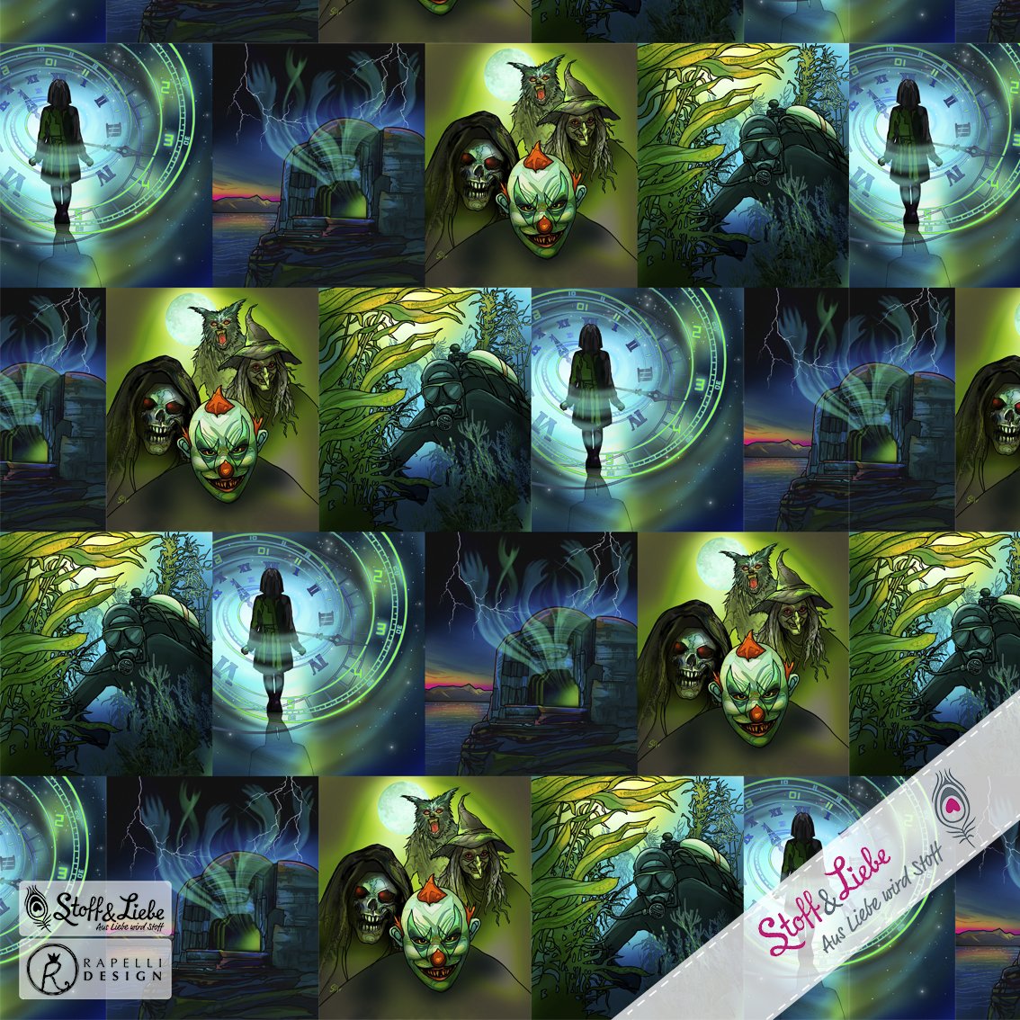 Als Allover haben wir diesen absolut coolen Stoff! Die Klassiker „Kreaturen der Nacht", "Tauchgang ins Ungewisse", "Der Geisterbunker" und "Die Zeitreisende“ vereint auf einem Stoff. Die Kästchen des French Terry haben eine Höhe von ca. 6,5 cm. Dadurch eignet sich dieser Stoff für Nähstücke in vielen Größen, ohne überladen zu wirken. Ob Ihr ihn solo vernäht oder mit Unistoffen kombiniert, er wird alle Blicke auf sich ziehen! Weil er so cool ist, gibt es ihn direkt auch noch als Canvas in unserem Shop, ebenfalls in Vorbestellung.